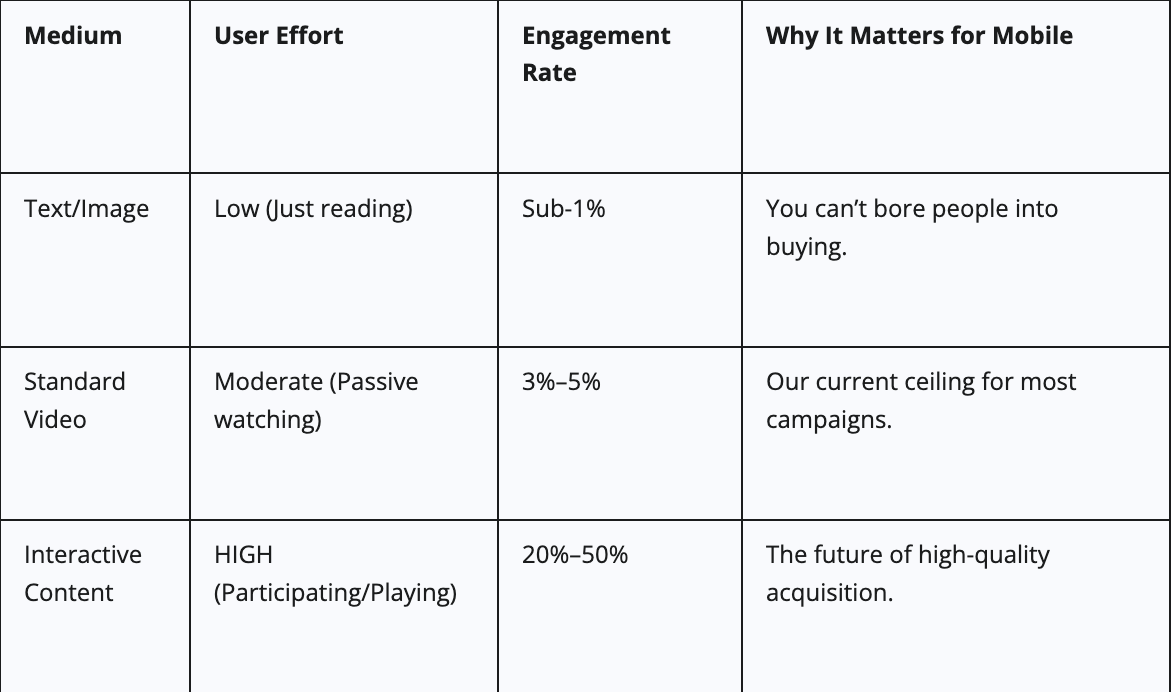 Content that asks for higher user effort (tap, choose, play) consistently delivers higher engagement (often 20–50%). In mobile advertising, that points to playable ads, personalized quizzes, and in-ad polls. This isn’t a niche, high-end tactic anymore, it’s how you break through shrinking attention and privacy constraints.